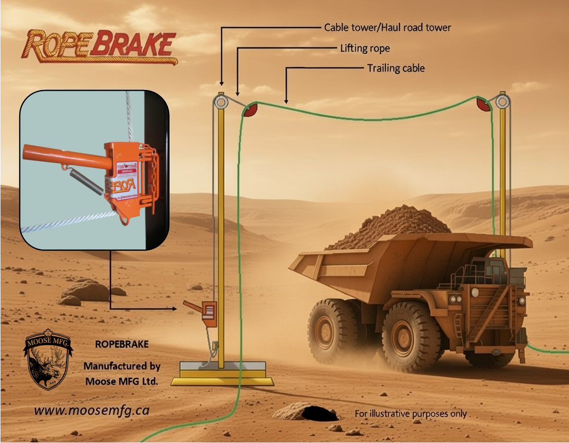 The Ropebrake is a mining safety device that automatically locks and secures lifting ropes when hoisting or lowering mine trailing cables at mine cable towers or haul road towers.